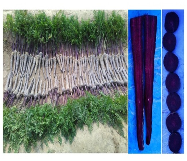 ·       Roots are black (solid purple) in colour and Danvers (triangular) ·       Ready to harvest in 95-105 days after sowing ·       Excellent source of anthocyanins (275-300 mg/ 100 g FW), total phenolics (300-325 mg GAE/100 g FW) and total flavnoids (130-150 mg CE/100 g FW) ·       Yield: 200-220 q/ha Recommended state: Uttar Pradesh Special attributes ·       Higher antioxidants ability (FRAP: 55-60 µmol TE/ g FW i.e. 22-fold higher than red/orange carrot) ·       Suitable for salad, juice, halwa, nutraceutical and food supplements Notification year: 2019 (SVRC-UP) Gazette Notification: S.O. 692 (E) dt. 05.02.2019 |